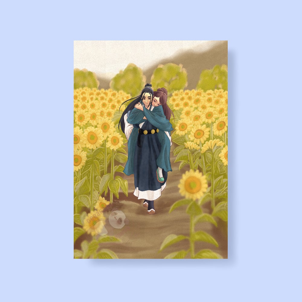 Illustration of a couple walking in an old Chinese Dynasty among sunflowers.